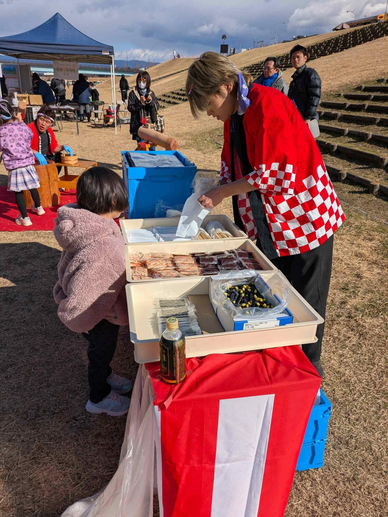 イベント開始時間の10時過ぎに会場に到着し、受付のテントへ行き餅つきのチケットを3人分購入。
