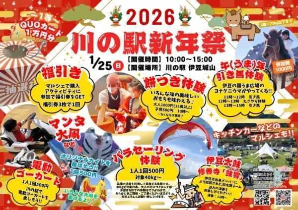 晴れ渡る空と澄んだ空気の中、雄大な城山を背景に、川の駅伊豆城山で「2026 川の駅新年祭」が開催されました。