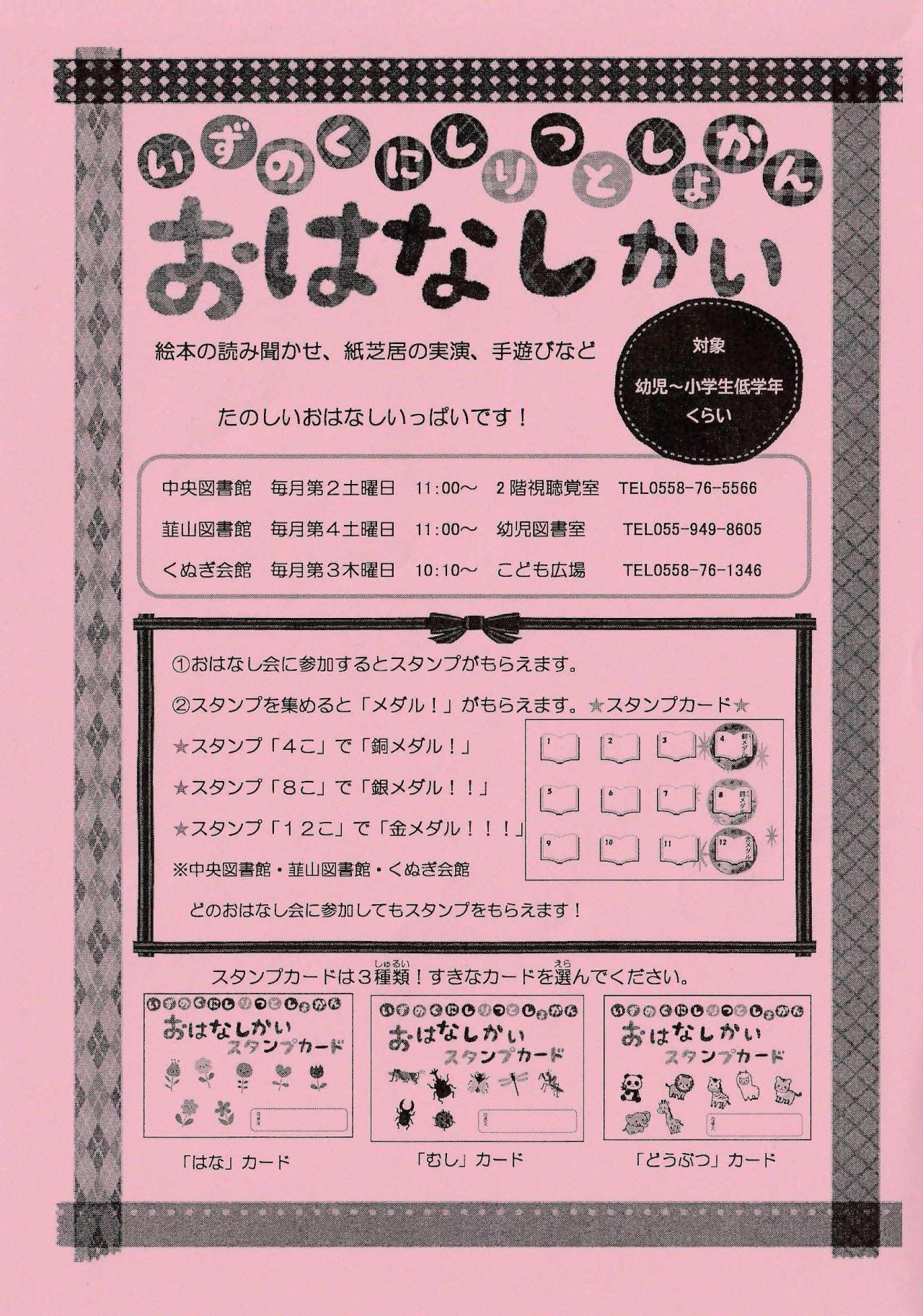 中央図書館・韮山図書館・くぬぎ会館で毎月行われているおはなし会に参加すると、スタンプがもらえます。