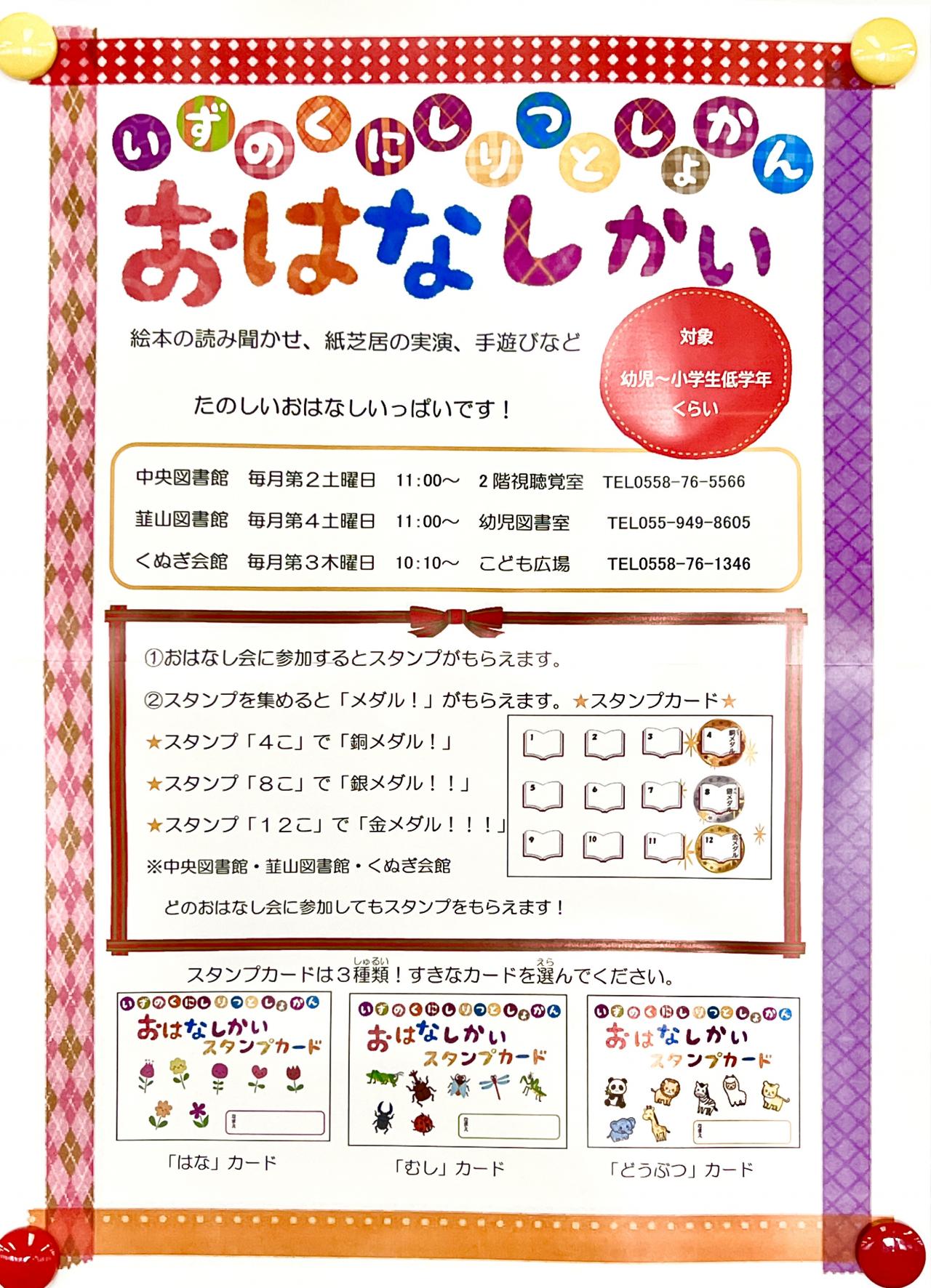 中央図書館、韮山図書館、くぬぎ会館でおこなわれる、どのおはなし会に参加してもスタンプを貰えます。
