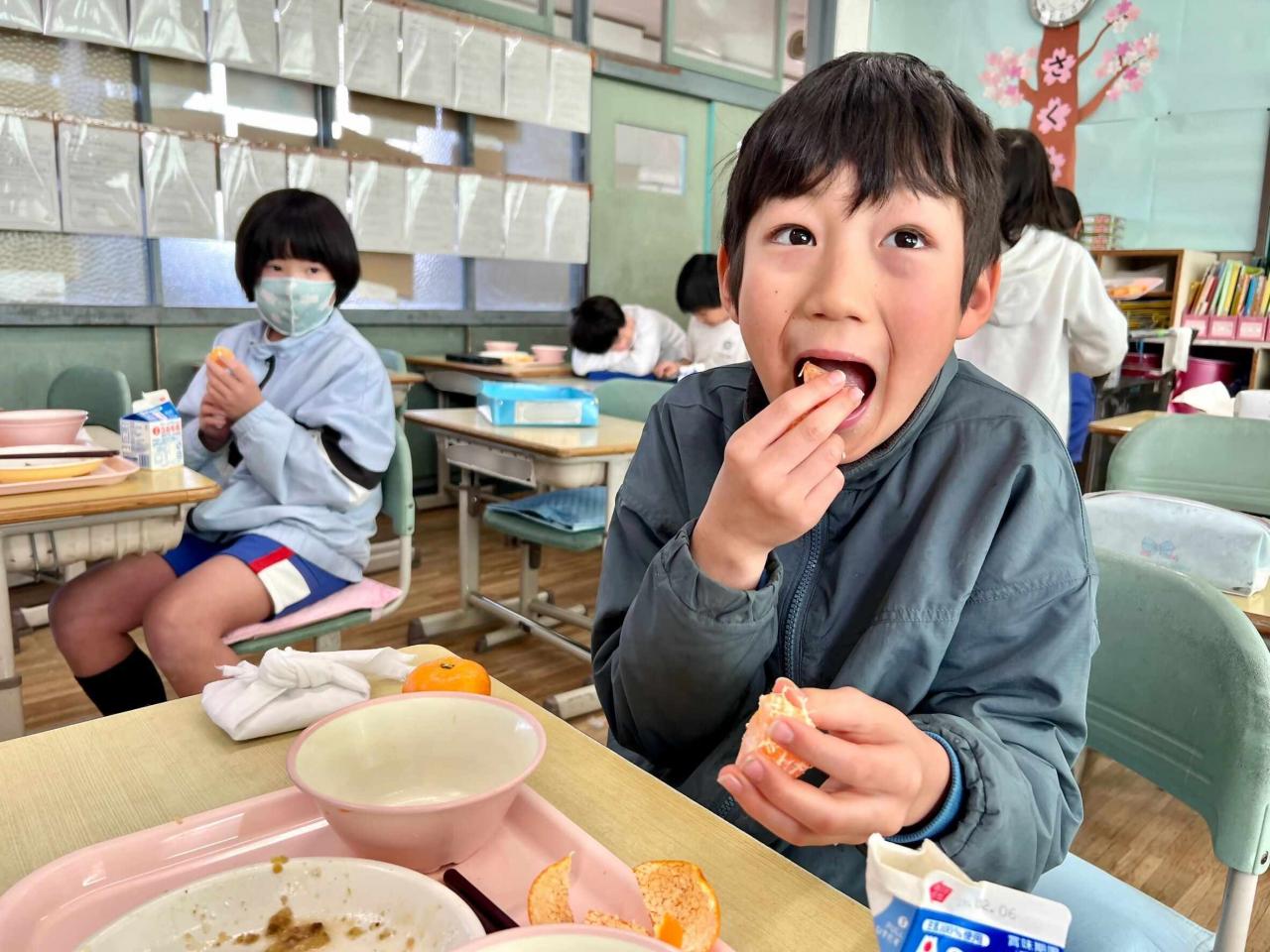 みかんをほおばる2年生