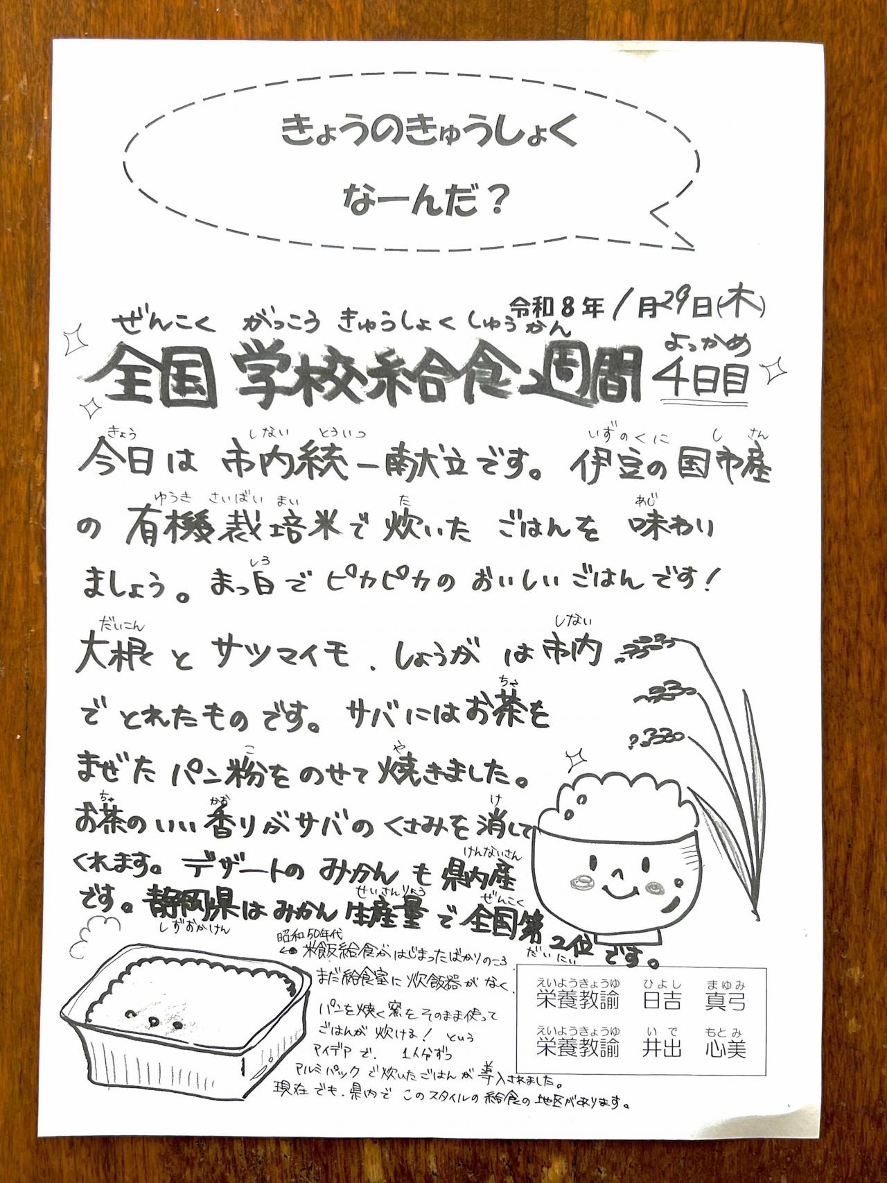 また、大根やサツマイモや椎茸は市内産、鯖や豚肉やみかんも静岡県内産という、まさに「地産地消」の献立です。