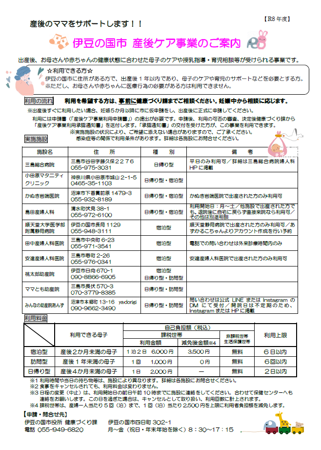 出産後、家族などから十分な家事・育児などの援助を受けることができない人で、お母さんや赤ちゃんの健康状態に合わせた母子のケアや授乳指導・育児相談などを受けることができます。妊娠中から相談に応じます。