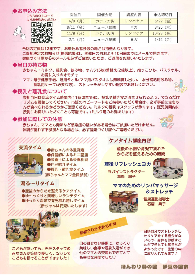 市民でおおむね生後4か月から1歳未満の乳児と母親 各回定員12組