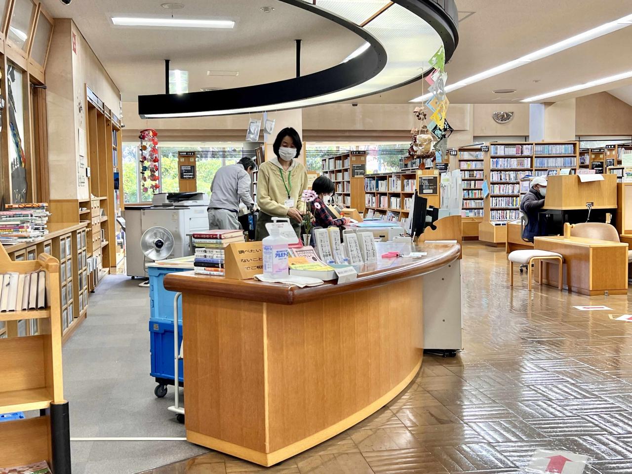 入室前に、まずは1階の受付カウンターへ行って『よむりん』を利用したいことを伝えてください。