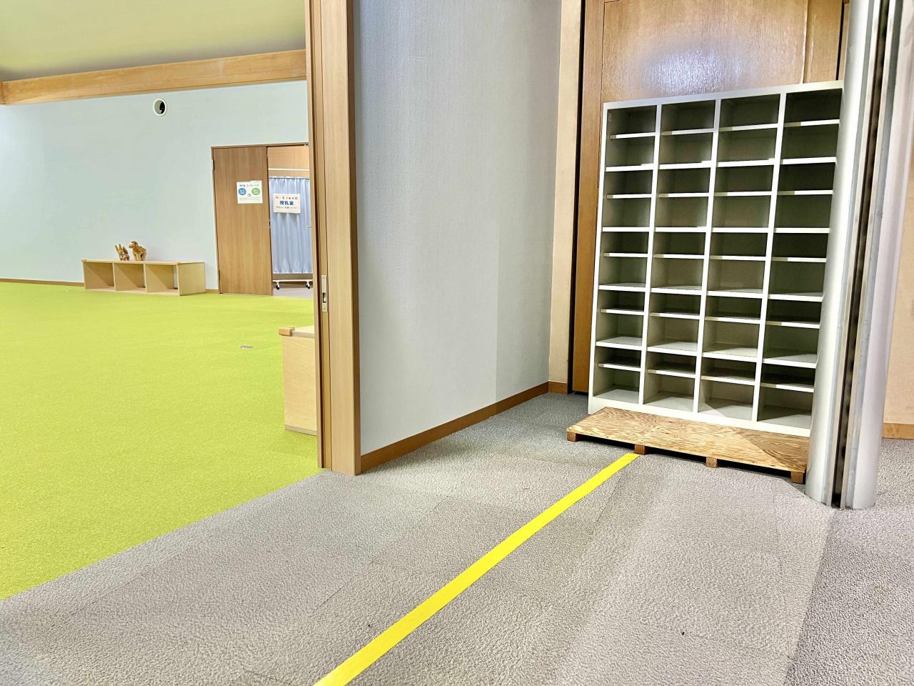 部屋の手前の黄色い線のところで靴を脱いでから入室してください