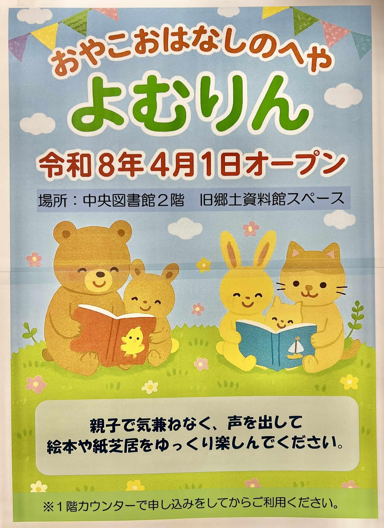 中央図書館の2階に、親子が気兼ねなく「声」を出して絵本や紙芝居などを楽しむことができる新スペース『おやこ おはなしのへや よむりん』が誕生します。